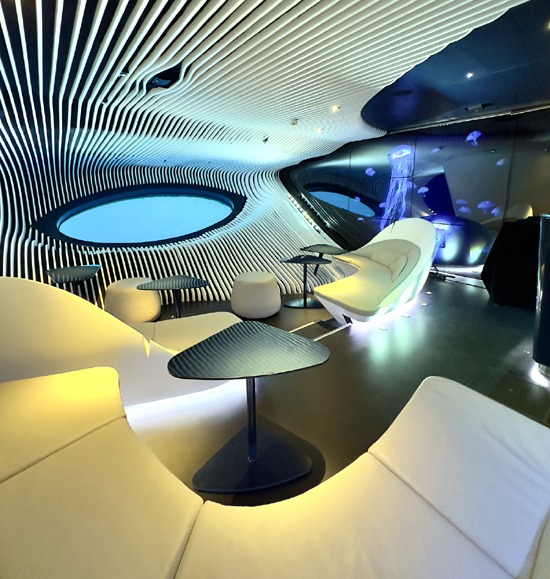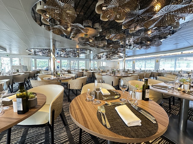 Beneath the waterline lies the Blue Eye, a futuristic lounge bathed in soft blue light, where one can glimpse marine life drifting past when the ship is at anchor. Thanks to its small size, Le Bougainville also makes landfall by Zodiac in places where large liners never drop anchor—far from the crowds, closer to what matters.
