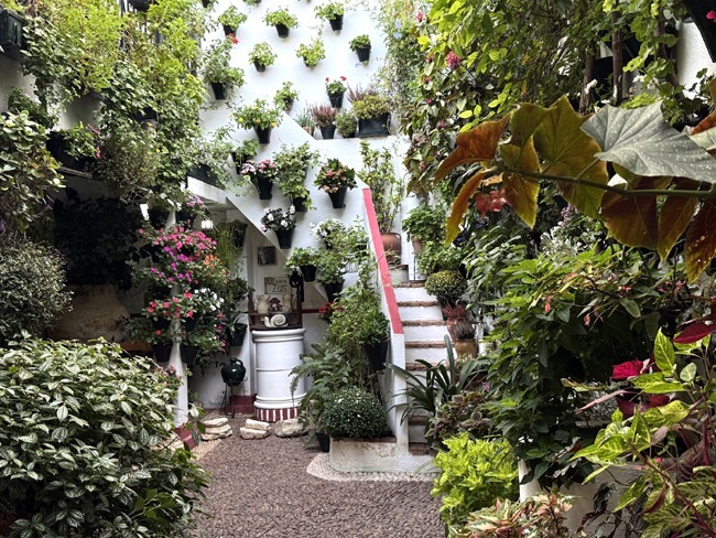 On my trip to Cordoba this past October, I was still able to view some private patios. In the San Basilio neighborhood, our group booked a tour (offered nearly year-round) that got us into the patios of five houses dating from the 16th to 18th centuries, a time when several poor families shared a communal courtyard. The common kitchen in some patios has been preserved and is on display. But the stars of the show are pots brimming with geraniums, impatiens, petunias, marigolds and other flower varieties, along with vines, shrubbery, rose bushes, and cascades of jasmine and raspberry-red bougainvillea. Orange, lemon, olive and fig trees also set the stage in these lush mini paradises, one of which is occupied by artisan shops specializing in handcrafted leather, ceramics, silver jewelry and perfumes.