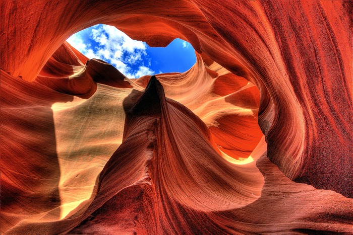 On Navajo land just outside of Page, an ethereal experience awaits hikers who squeeze through the tight passageways of Antelope Canyon, one of the Southwest’s most pictured natural wonders. The caverns’ smooth, curvy walls of pinkish-orange sandstone glow with sunlight streaming through small gashes in the rock above. Led by a Navajo guide, our cavern crawl involved ladders and stairways.