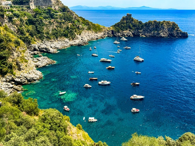 Vietri Sul Mare: The far eastern gateway to the Amalfi Coast, 10 minutes from larger Salerno, is my personal favorite getaway. Vietri sul Mare has been famed for its ceramics since the 15th century. As the pace is definitely slower than in other Amalfi towns, locals appear more relaxed, even in the heart of high season. As you walk through the center of town, you’ll see storefronts and building facades lined with ceramic mosaics. There’s even a wall fountain made of Vietri ceramics. Vietri sul Mare is the only Amalfi town accessible by train from Naples, and can be easily reached by car via the A3 highway.
