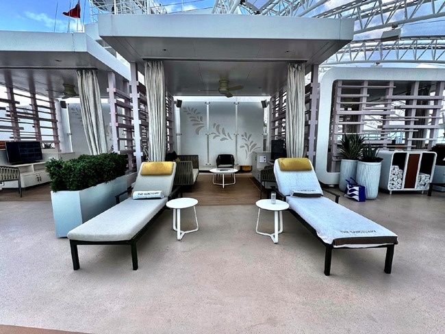 A quiet oasis away from the bustling energy found elsewhere on the ship, there is plush lounge seating, private cabanas, a pool and jacuzzi and light bites and drink service.