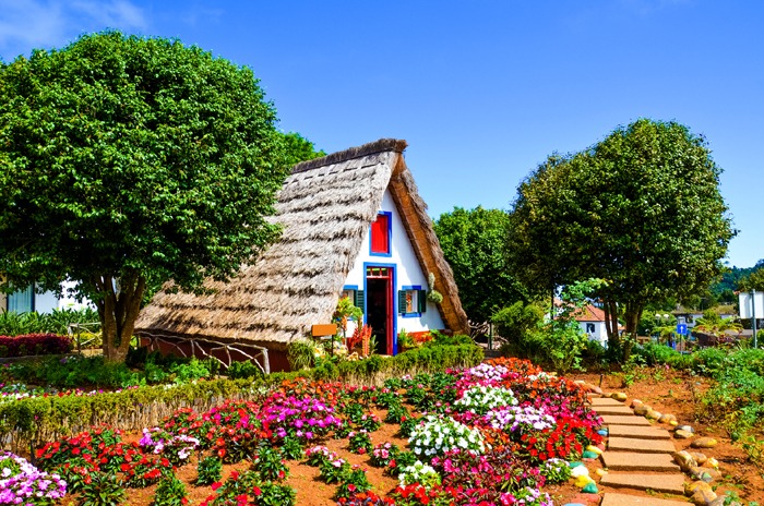 - Amazing traditional houses in Santana, Madeira, Portugal. Wooden, triangular houses represent a part of Portuguese heritage. Front garden with beautiful colorful flowers. Tourist landmark.