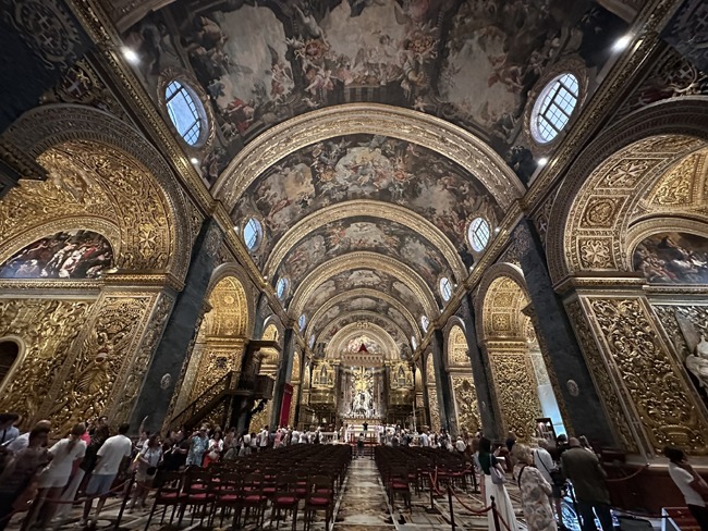 Inside St. John’s Co-Cathedral, I found one of the most astonishing churches I’ve ever visited. The floor, inlaid with marble tombstones of knights, the richly gilded interior, and Caravaggio’s dramatic Beheading of Saint John left me speechless.