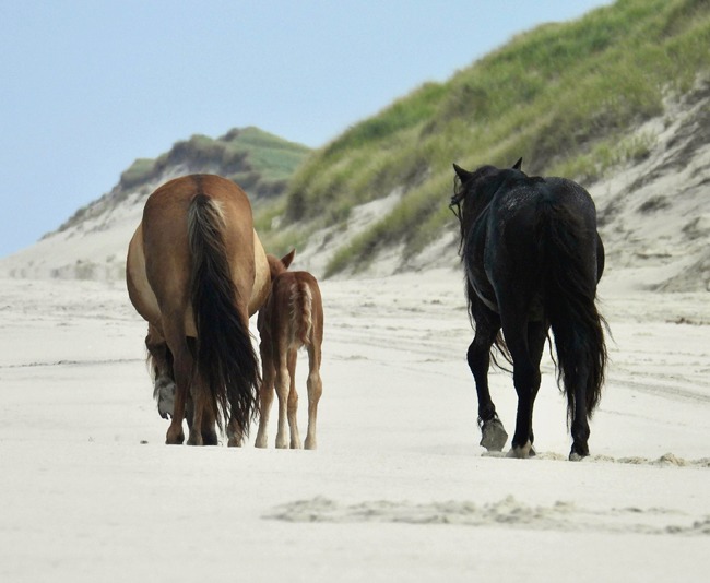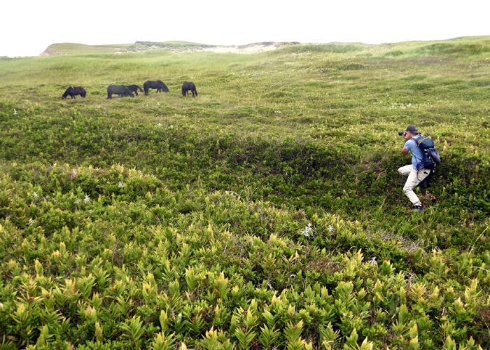 Two of many moments with the horses stand out. A mare, stallion and foal meander down the beach. Nearby, there’s a “horse highway” as dozens of horses in different bands visit freshwater ponds.