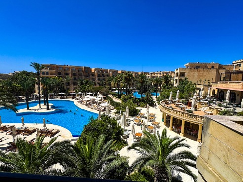 Tropical gardens embrace the 323,000-square-foot property, which will undergo a multi-tier renovation during its next off-season. “Due to our mild climate, our travel season begins in April and does not end until November,” said marketing coordinator Clive Rotin, a native Gozitan. “The main selling point of our hotel is the three swimming pools, as we receive many families and couples wishing to relax.”