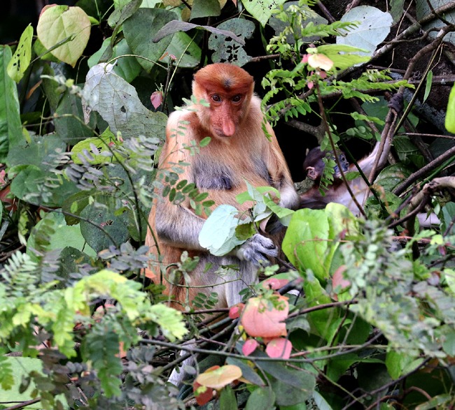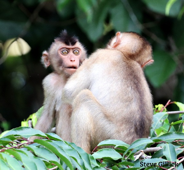In the Outdoor Nursery, not far away, young Orangutans and macaques interact with their mothers and other family members and feed with them. And on the return boardwalk, we encountered a venomous Bornean Keeled Pit Viper and a non-venomous Gray-tailed Racer snake, as well as a White-lipped tree frog, and a wide-eyed Flying Lemur (Colugo), hugging a tree.